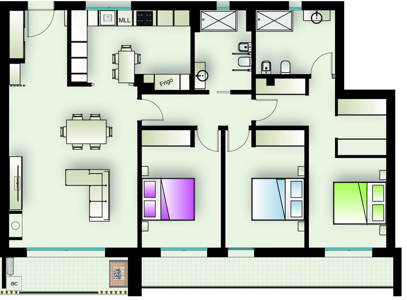 Composto por suite, 2 quartos, casas de banho com bases de duche e louças suspensas, lavandaria, sala de estar e de refeições com recuperador de calor e cozinha totalmente equipada.